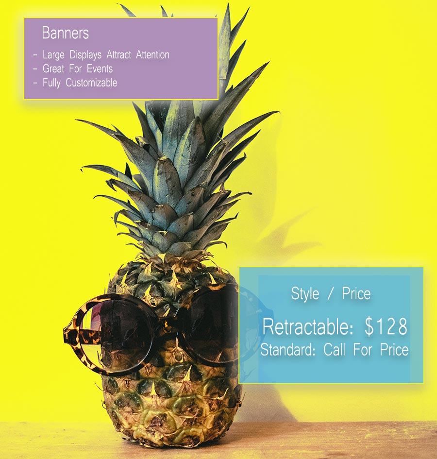 Banners are a large, highly visible way to attract attention. Perfect for events, these eye-catching banners make a great addition to retail and information booths. Fully customizable. Available in a wide variety of sizes, styles, and materials. Our retractable banners are highly portable and make utilizing banners a breeze.