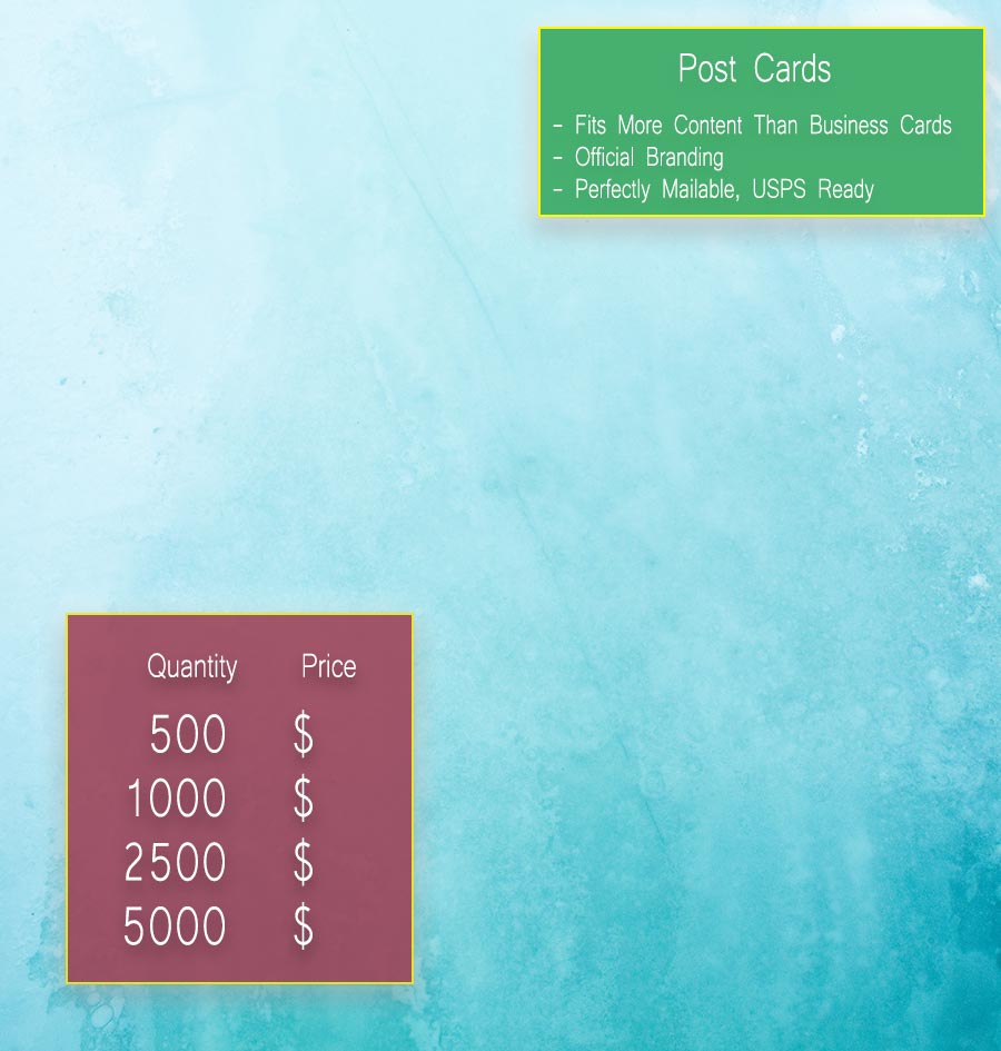 Post Cards are an excellent way to distribute information to your potential clients. Ready for postage and mailing through USPS, these are perfect for Thank You Messages, Promotions, and More. Remind your clients about your product no matter the distance. These are also great to hand out to others who can then pass them on. Customize and Order Your Post Cards, Today.