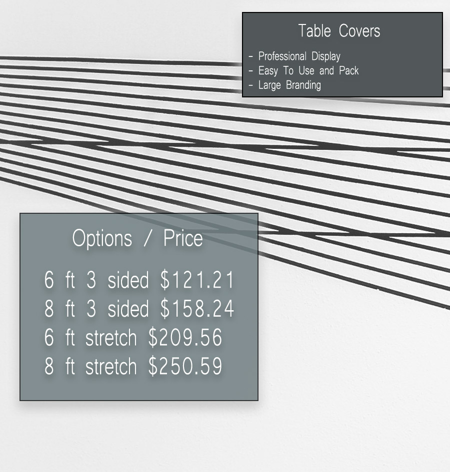 Table covers turn your folding table into a professional looking display at events. Use these to set up an attractive sales booth. High resolution, custom printed graphic. Available in 6ft or 8ft regular 3 sided version with an open back or 6ft or 8ft stretch version that easily slips over the entire table for a sleek look. They are lightweight and easy to pack, 100% washable, and scratch resistant. Ensure your booth makes a great first impression with one of these high quality table covers.